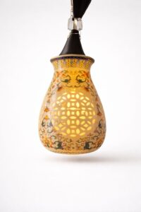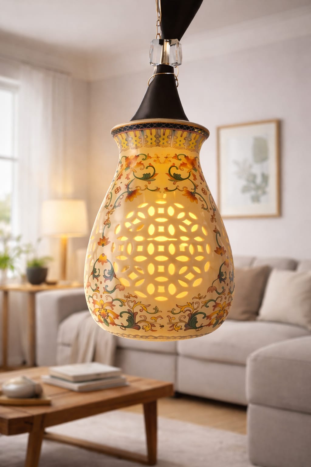 Add a warm, artistic glow to your space with this handcrafted floral mosaic hanging pendant lamp. Featuring a delicately perforated ceramic shade adorned with intricate hand-painted floral motifs, this lamp creates a mesmerizing play of light and shadow when illuminated. The soft golden light enhances its ornamental cutwork design, making it a perfect statement piece for living rooms, dining areas, bedrooms, or boutique interiors.